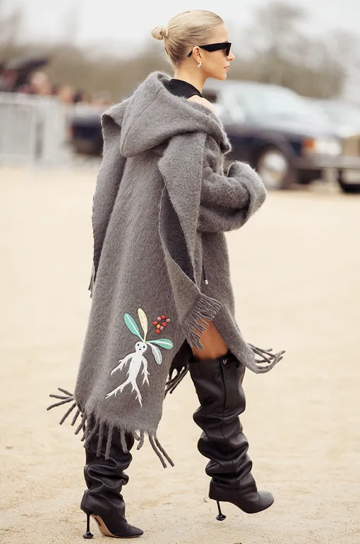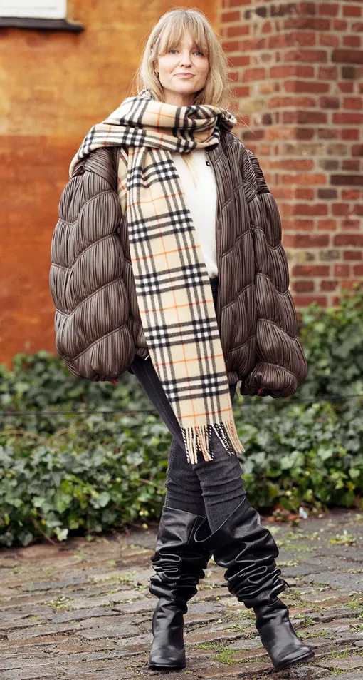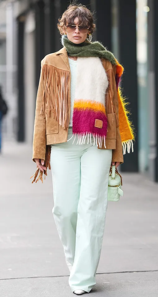 Посмотри на стритстайлы с Недель моды и аутфиты фэшн-блогеров: может, не в каждом первом, но в каждом втором look’е есть шарф. В сезоне 2025/2026 больших тенденции две: это либо широкий гладкий палантин ровно под цвет пальто / пуховика, либо яркий шарф-заявление. Обе фишки хороши и имеют право на жизнь в твоем гардеробе!