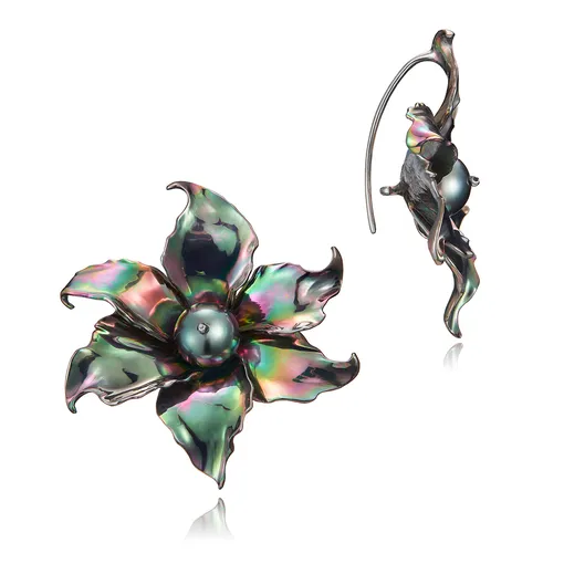 Морской жемчуг Таити – главный акцент композиции – замечательно поддержал эту концепцию. Его глубокий цвет потребовал от ювелиров кропотливой работы — обжиг титана меняли многократно, чтобы добиться гармоничного сочетания двух непохожих материалов.