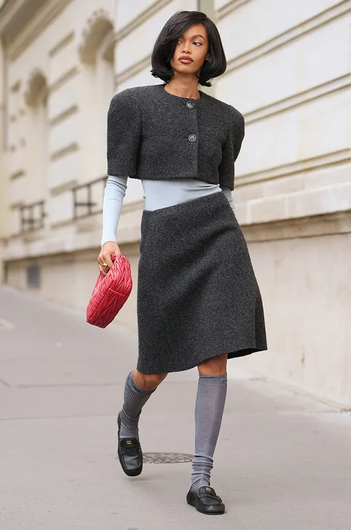 В качестве стилизации парижанки выбирают яркие контрасты с белым или черным. Большое преимущество тренда в том, что вещи из серой шерсти можно интерпретировать как в повседневном, так и в элегантном стиле.