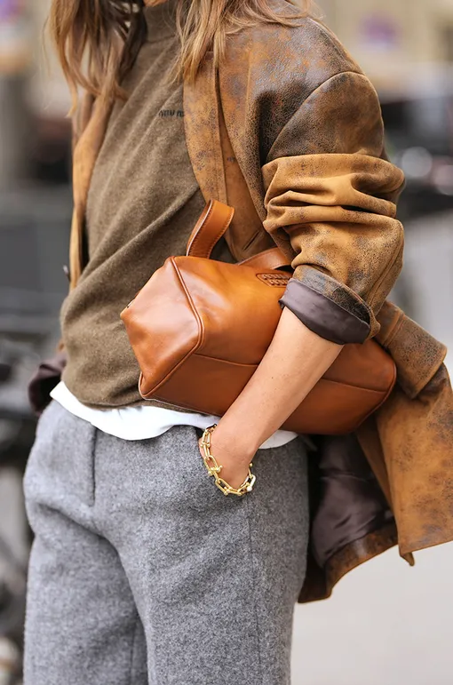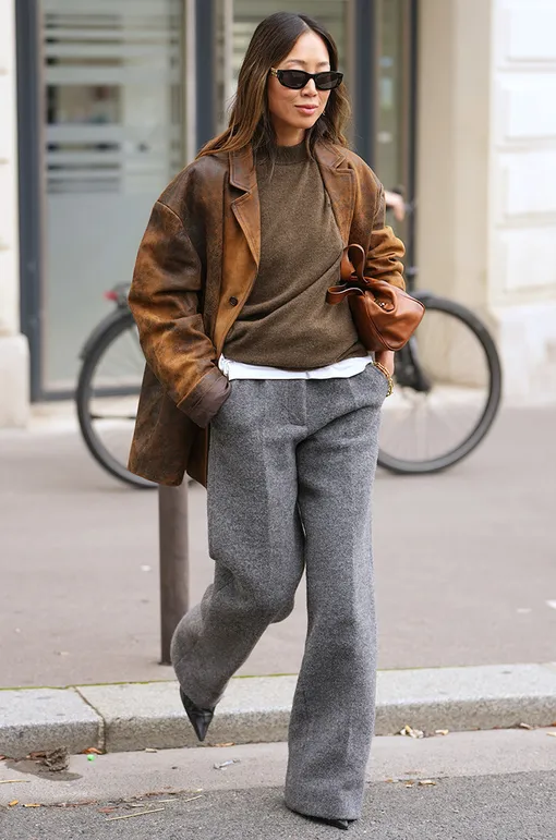 Серый шикарно смотрится и в комбинации с модным коричневым оттенком. Сочетай серые брюки из вареной шерсти с коричневым объемным свитером и простой белой рубашкой с длинными рукавами в качестве базового слоя. Туфли на каблуке с острым носком добавят элегантности, равно как минималистичная сумка и солнцезащитные очки. Для более смелого образа подойдет объемный замшевый бомбер, создающий яркий контраст с лаконичным классическим стилем.
