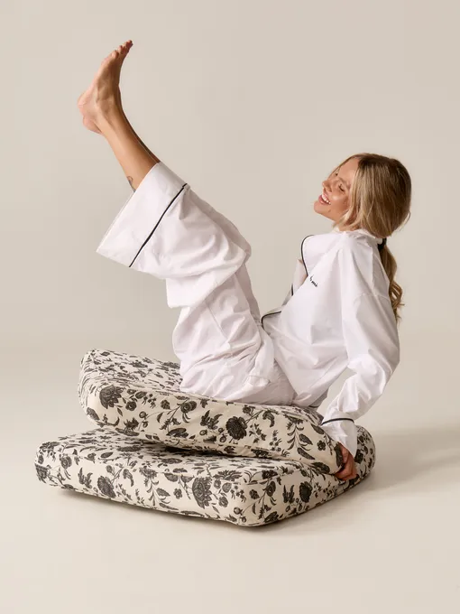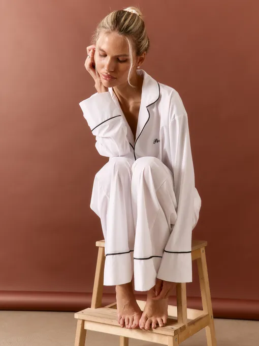В центре дропа — классический пижамный силуэт с английским воротником, выполненный в молочном оттенке. Чистый цвет, контрастный кант и деликатная вышивка с лого создают ощущение собранности и элегантности даже в домашнем образе. Свободный крой не сковывает движения, а ткань мягко ложится по фигуре, подчеркивая естественность и хрупкую силу женского образа. Нежность, одним словом.