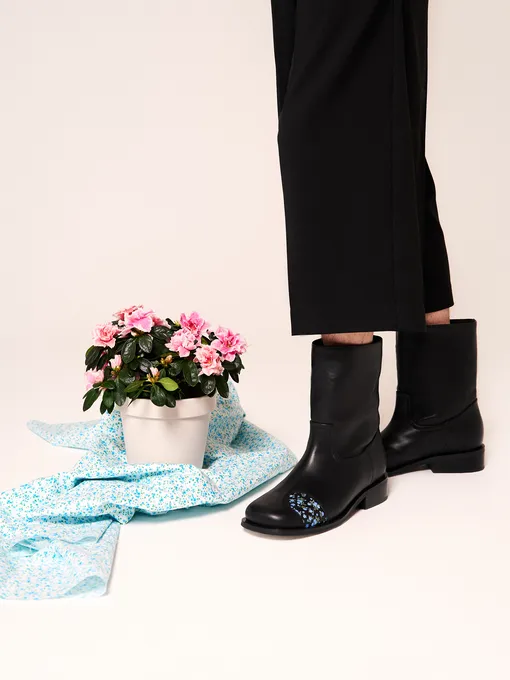 NEVALENKI, кажется, решили поднять уровень счастья в нашей крови. Спонсор окситоцинового бума – переосмысленные ковбойские ropper boots с квадратным мысом и милейшим цветочным принтом. Аппликации выполнены по мотивам творчества шуйских ситцев и натюрмортов.