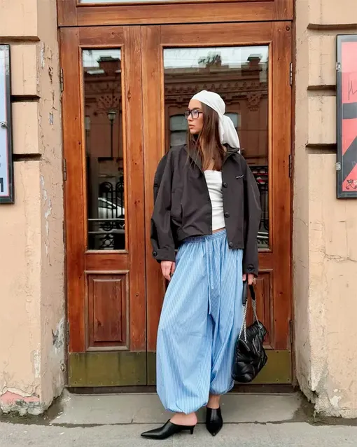 Единственное, что нужно учитывать, когда собираешь аутфит с трендовыми шароварами – соблюдать гармонию плотностей. Если говорить проще, надеваешь шерстяное пальто – к нему подойдут плотные и визуально тяжелые брюки, например, из шерсти или нейлона. С тренчем классно будут смотреться «аладдины» из хлопка, скажем, в пижамном стиле. А вот в вопросе оттенков – полная свобода действий!