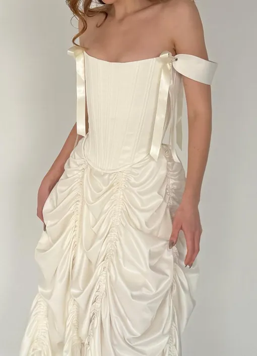В новой коллекции бренд заигрывает с нестандартными фактурами. Экокожа с легким эффектом состаренности придает винтажный характер комплекту Timeless, состоящему из топа-бандо и миди с деконструированным подкладом. А платье Surrealist из жатой ткани объединяет вдохновение сюрреализмом с изящными формами. Здесь каждую деталь стоит (и хочется) изучить – поверь!