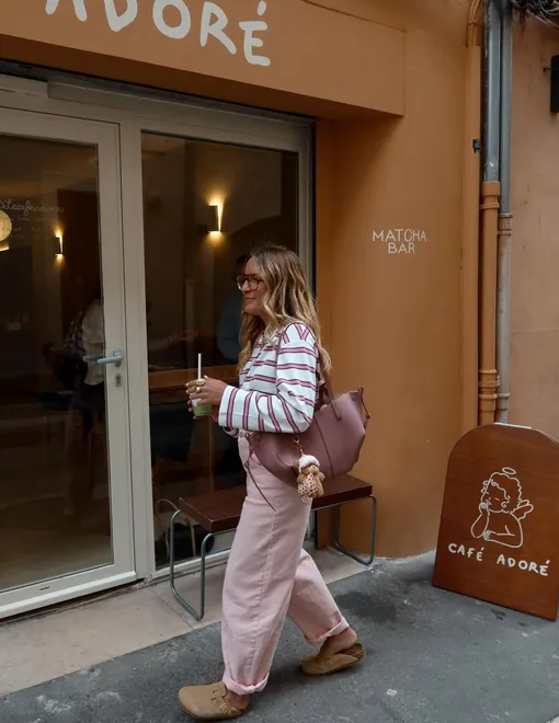 Вот тут внимание – перед нами большой тренд! О цветных джинсах в этом сезоне мы будем говорить еще не раз, и начнем эту эпопею с того, что подскажем тебе простой, но стильный образ с розовым денимом. Подбери новенький лонгслив в полоску и удобные биркенштоки или челси – получится крутое комбо!