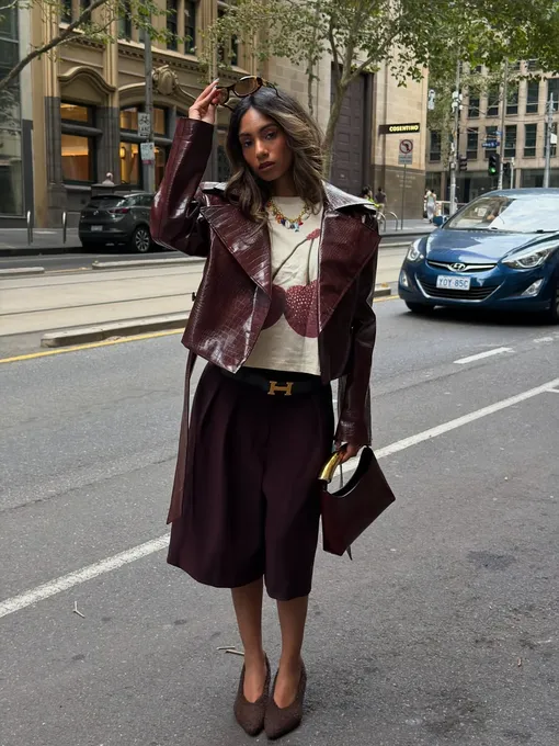Это, пожалуй, наше любимое комбо, найденное в архивах модных блогеров. Монохромные костюмные шорты в паре с укороченной кожанкой того же цвета – вот это эффектный дуэт! В таком случае выбирай лонгслив контрасного оттенка, чтобы подсветить контраст фактур.