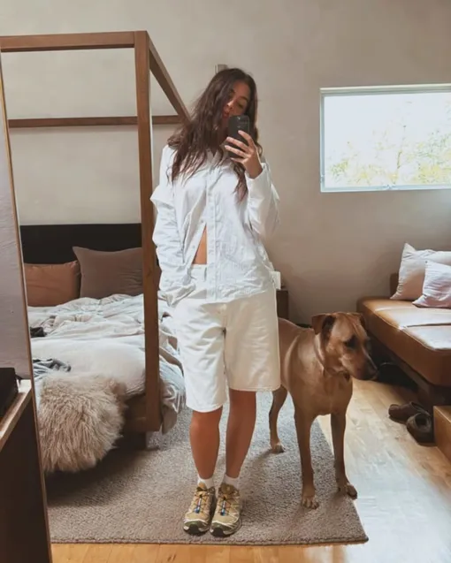 «Я не люблю носить что-то слишком обтягивающее, особенно учитывая, что моя работа требует много физического труда. Моя классическая униформа: футболка оверсайз или укороченная майка, мешковатые винтажные джинсы Levi’s или спортивные штаны Skims и кроссовки Salomon», — делилась Молли, говоря о любимых вещах.