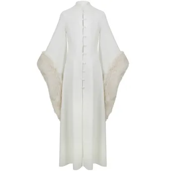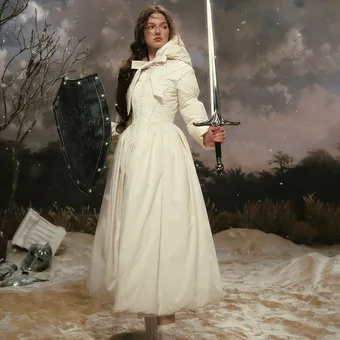 Но это только одна сторона возродившегося к весне-2026 каслкора. Другое его воплощение – образы, будто сошедшие со страниц старинных сказок. Платья с богатой меховой инкрустацией (будто Царевна-лебедь!), пуховики-платья (знаменитые модели Lacemade наводят в соцсетях шумиху), бархатные воротники, которые носят с блузами и топами – тоже осовремененный каслкор.