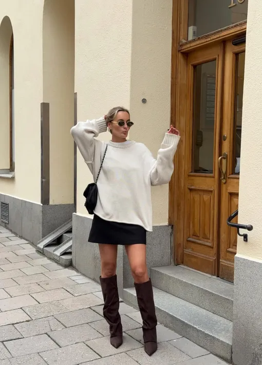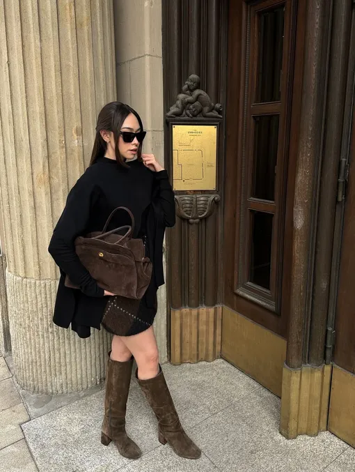 Для стильного образа в офис дополняй комбо юбкой-карандаш. Только учитывай, что юбка должна находить на голенище сапог, чуть-чуть их прикрывая. Тогда ноги будут выглядеть визуально стройнее, а ты – выше.