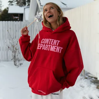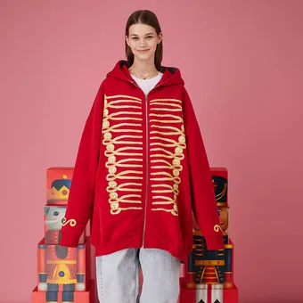 А если ты совсем не настроена на вечерний look, хватай красный дизайнерский свитшот. Не базовый, а с надписями или декором. Нам нравится, как дизайнеры в этом сезоне делают отсылки к «Щелкунчику», добавляя на худи золотые эполеты и нашивки, принты и прочую «сказочную» фурнитуру.