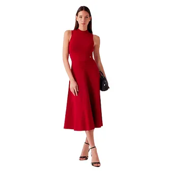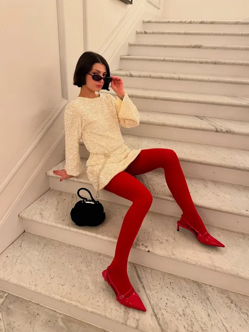 Если не хочешь искать нвоое красное платье, надень то, которое у тебя уже есть – главное, чтобы оно было монохромным. Заверши аутфит плотными красными колготками и туфлями в тон: ноги будут выглядеть длиннее, и наряд «сложится». Вид на миллион!