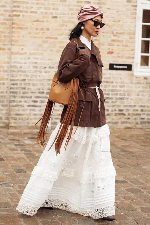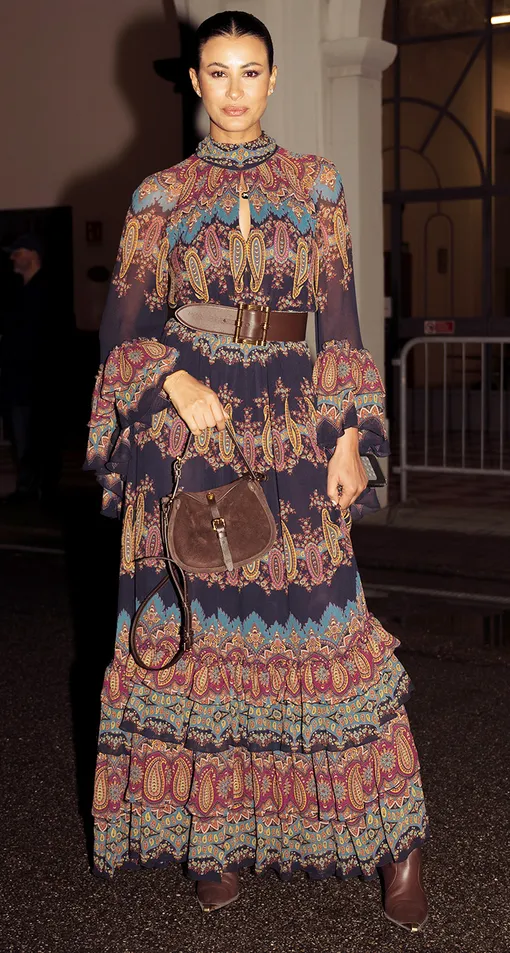 В гардеробе такой женщины — льняные и шелковые платья, блузы с вышивкой, широкие брюки c растительными принтами, меховые жилеты, объемные сумки, украшения ручной работы, привезенные из путешествий. Такой стиль соединяет роскошь и утилитарность, культурные традиции и современность.