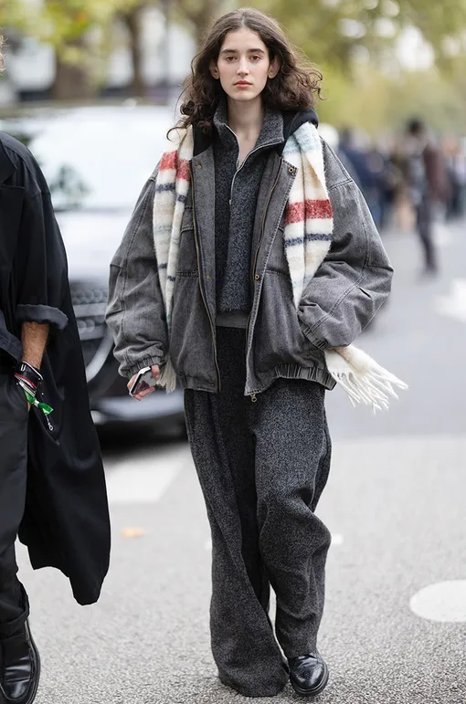 Она выбирает многослойность, лаконичные силуэты и спокойные цвета. Ее образ — как продуманная лекция: в нем все подчинено логике. Гольф, рубашка, удлиненный жилет, прямые брюки, очки в толстой оправе, сумка-папка — все говорит об уважении к знанию.