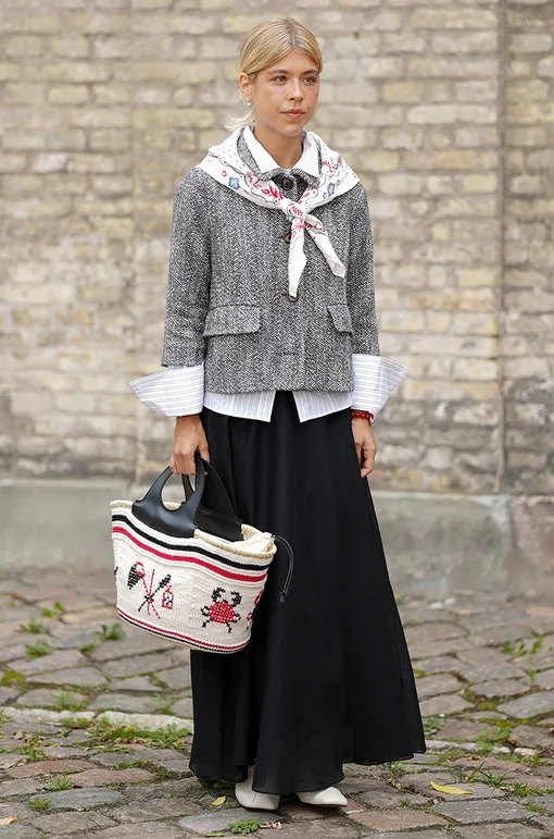 Она носит асимметричные жакеты, длинные драпированные платья, свободные блузы, юбки с этно-принтами, широкие ремни, вышитые сумки и множественные украшения.