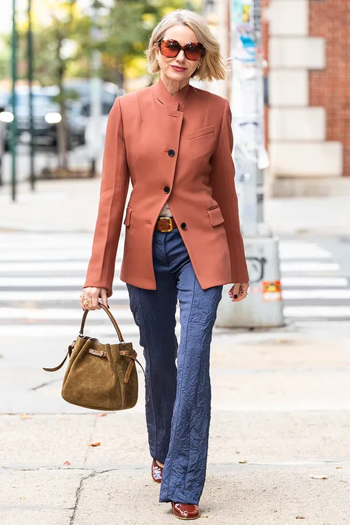 В элегантный смарт-кэжуал отлично впишется замшевая сумка-ведро, уверена Наоми Уоттс (она прогуливается с аксессуаром модели Romy от Tory Burch).