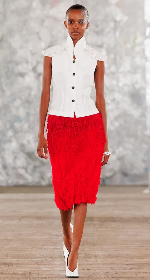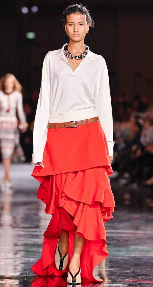 И выбор этот совершенно не случаен. Если изучить и другие показы сезона весна-лето, то можно убедиться: красные юбки будут с нами в новом сезоне, а значит уже пока подыскивать себе эту вещь. Да и зачем вообще откладывать до весны? Можно взять пример с Тессы и уже интегрировать обновку в гардероб, к тому же в осенне-зимнюю палитру, где среди фаворитов заявлены оттенки коричневого и бордо, красная юбка впишется без проблем.